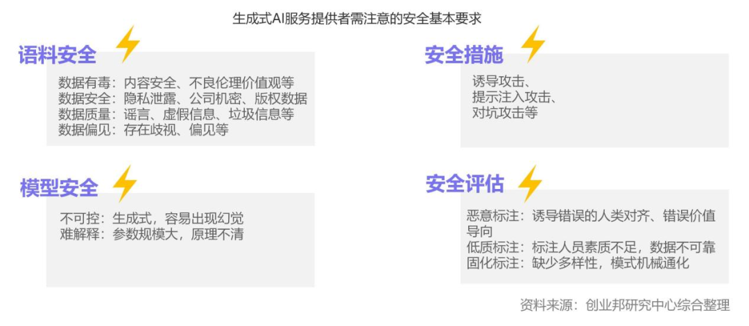 2024年1月,普华永道对全球4700多名CEO进行的调查显示,虽然企业普遍追逐生成式AI潮流,但全球77%的首席执行官对这项技术可能带来的网络安全风险感到担忧。规范性举措如何制定,取决于产业发展阶段。也就是说,安全与技术能力保持同步非常重要。同时,生成式人工智能的风险治理需要贯穿产品的全生命周期,包括模型训练、服务上线、内容生成、内容发布与传播各阶段。