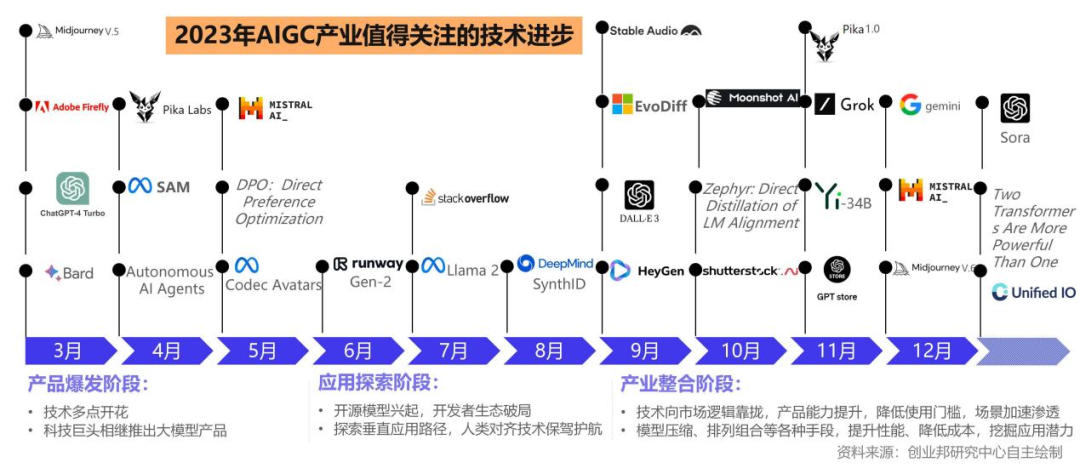 2023年技术发展以transformer框架下的优化为主,如开源模型、多模态、长文本、Agent等关键技术大放异彩。随着工具链的完善和开发者生态的构建,transformer的变种将在应用领域发挥奇效。继Q3相对沉寂后,年末细分领域龙头技术优化密集发布,产业已进入整合阶段,新的进入者需要仔细考量技术定位、产品设计、市场策略。