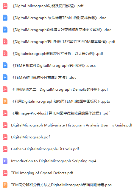 DM简单易学,功能强大,包括TEM电镜图片加标尺、图像上色美化、SAED衍射图案标定、晶面间距量取、衬度调整、EELS谱线分析、样品厚度计算、元素标定、分布mapping、高分辨图像信息挖掘等!