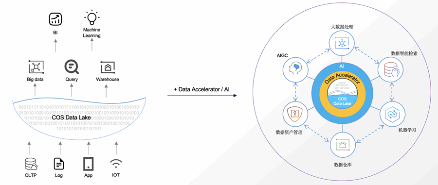 腾讯云COS Data Lake结合了数据加速和AI能力,从支持传统的数据分析和ML业务,向智能数据湖演进。通过数据湖的智能数据处理和AI大模型对数据的多模态特征提取,我们可以更加有效地处理大规模的数据,提高数据分析和机器学习业务的效率。