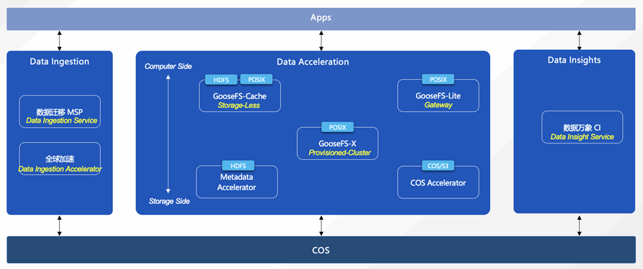 3. 数据加速:数据加速服务是数据湖的核心,从计算端到存储端提供了丰富的数据加速产品,包括GooseFS系列产品、元数据加速和COS加速等。这些加速服务提供了丰富的访问协议,来对接各种计算平台,提升计算平台的效率。