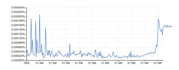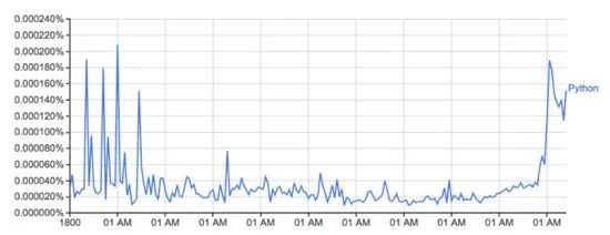 这幅图来自:books.google.com/ngrams… ,描绘了单词 ‘Python’ 的使用量随时间的变化。