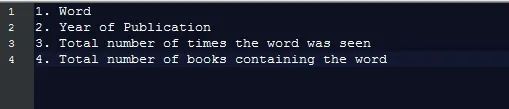 差不多 170 秒(3 分钟)之后, one_grams 是一个 numpy 数组,里面包含差不多 14 亿行数据,看起来像这样(添加表头部为了说明):