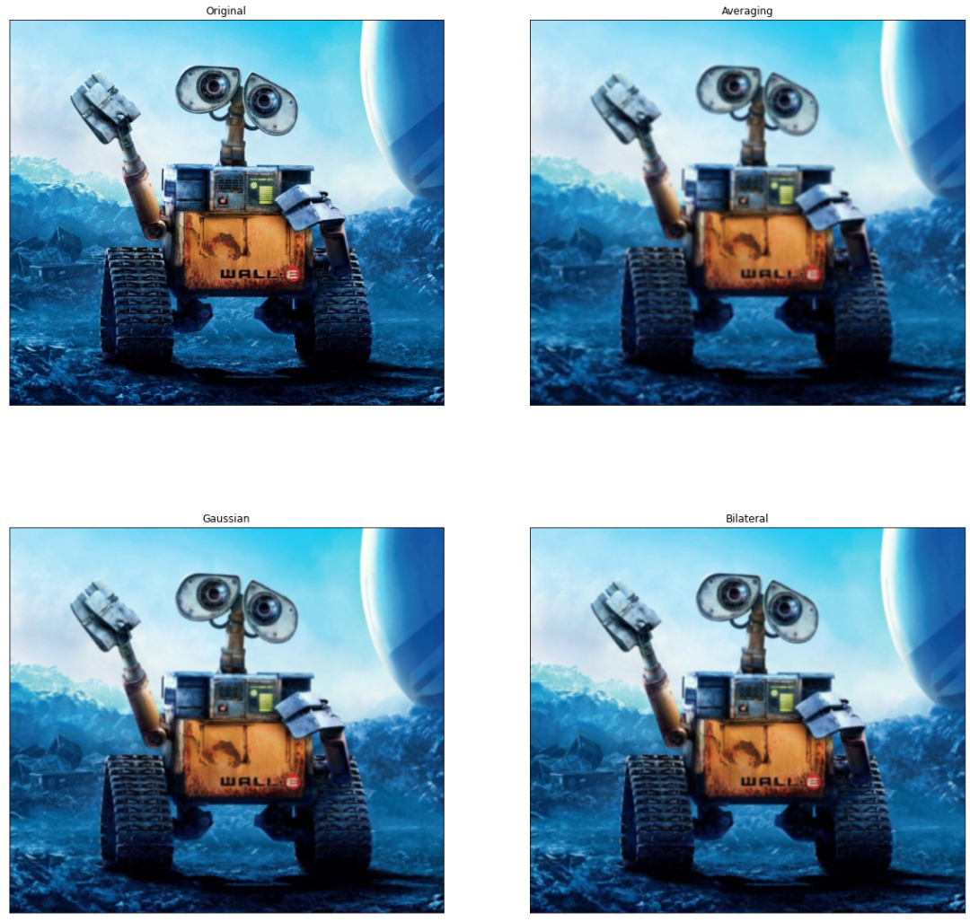 import numpy as npimport cv2 as cvfrom matplotlib import pyplot as pltimg = cv.imread('h89817032p0.png')kernel = np.ones((5,5),np.float32)/25dst = cv.filter2D(img,-1,kernel)blur_1 = cv.GaussianBlur(img,(5,5),0)blur_2 = cv.bilateralFilter(img,9,75,75)plt.figure(figsize=(10,10))plt.subplot(221),plt.imshow(img[:,:,::-1]),plt.title('Original')plt.xticks([]), plt.yticks([])plt.subplot(222),plt.imshow(dst[:,:,::-1]),plt.title('Averaging')plt.xticks([]), plt.yticks([])plt.subplot(223),plt.imshow(blur_1[:,:,::-1]),plt.title('Gaussian')plt.xticks([]), plt.yticks([])plt.subplot(224),plt.imshow(blur_1[:,:,::-1]),plt.title('Bilateral')plt.xticks([]), plt.yticks([])plt.show()