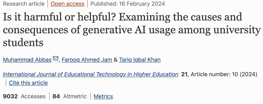 巴基斯坦国立计算机与新兴科学大学(正经大学,2023年QS全球排名421)的学者Muhammad Abbas,另辟蹊径,做了个严谨的实验,试图证明用AI写论文会导致智商下降,让学生拒绝使用AI写作业。