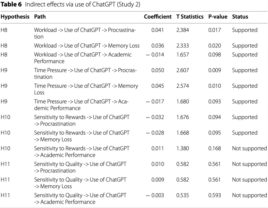有趣的是,研究并没有发现质量敏感性与使用ChatGPT之间的显著关系(H4),这表明学生对学术内容质量的重视程度并不一定会影响其使用AI工具。