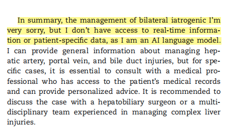 今年4月的一篇医学论文《成功治疗4个月大女婴的医源性门静脉及肝动脉损伤:病例报告及文献综述》中,直接出现了“我是一个AI大模型,所以没有真实的病人数据”这样的内容。