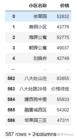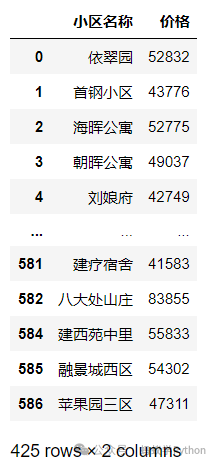 [['西井三区', '48827'], ['西黄新村南里', '48569'], ['苹果汇', '48411'], ['金顶北路20号院', '价格待定'], ['金顶北路22号院', '价格待定'], ['金顶北路59号院', '价格待定'], ['金顶街9号院', '55555'], ['金顶山路168号院', '价格待定'], ['金冬苑', '价格待定'], ['金夏苑', '价格待定'], ['西福园', '价格待定'], ['九中教工楼', '50059'], ['宏开花园', '价格待定'], ['西山汇', '22274'], ['琅山村小区', '价格待定'], ['东下庄路38号院', '价格待定'], ['馨领域', '65673'], ['重兴园小区', '52239'], ['六场宿舍', '51261'], ['京汉铂寓(京汉旭城三期)', '66176'], ['京源路1号院', '价格待定'], ['久筑社区', '价格待定'], ['京原路68号院', '42442'], ['古城西路15号小区', '56896'], ['安和家园(石景山)', '31111']]6、批量调用存入Dataframe 爬取所有数据