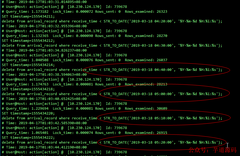 #执行小批量delete后会返回row_count(), 删除的行数 #程序判断返回的row_count()是否为0,不为0执行以下循环,为0退出循环,删除操作完成 DELETE FROM arrival_record WHERE id<@need_delete_max_id LIMIT 20000; select ROW_COUNT(); #程序睡眠0.5s