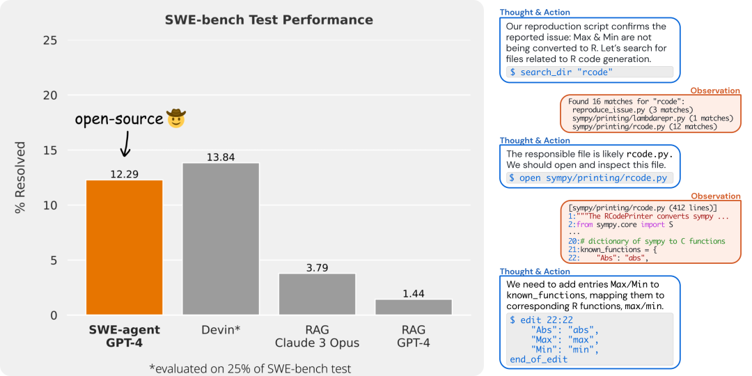 普林斯顿大学推出的 AI 工程师,在 SWE-bench 测试中修复了 12.29% 问题,成绩接近 Devin。(star 6.6K)