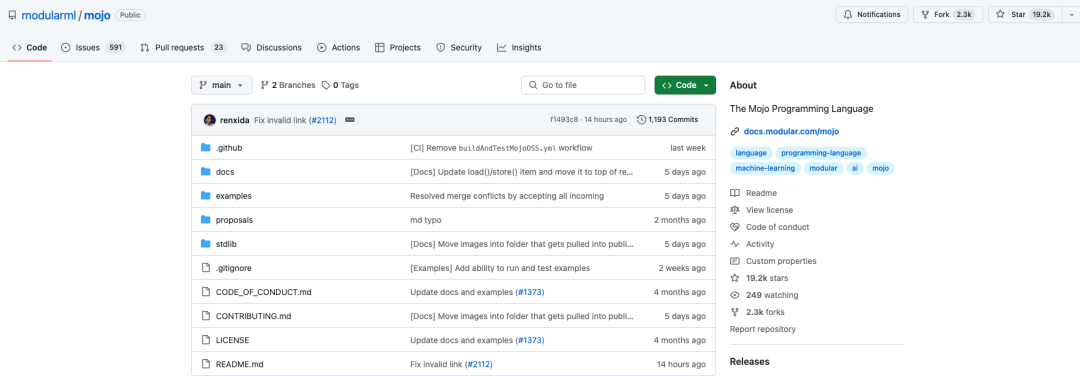 现如今,Modular 再次展开布局,官宣开源 Mojo 核心组件(https://github.com/modularml/mojo)。基于开源开放的方式,这一项目在短短时间内迅速吸引全球开发者的关注,GitHub Star 数攀升到 19.2k,Fork 达 2.3k。