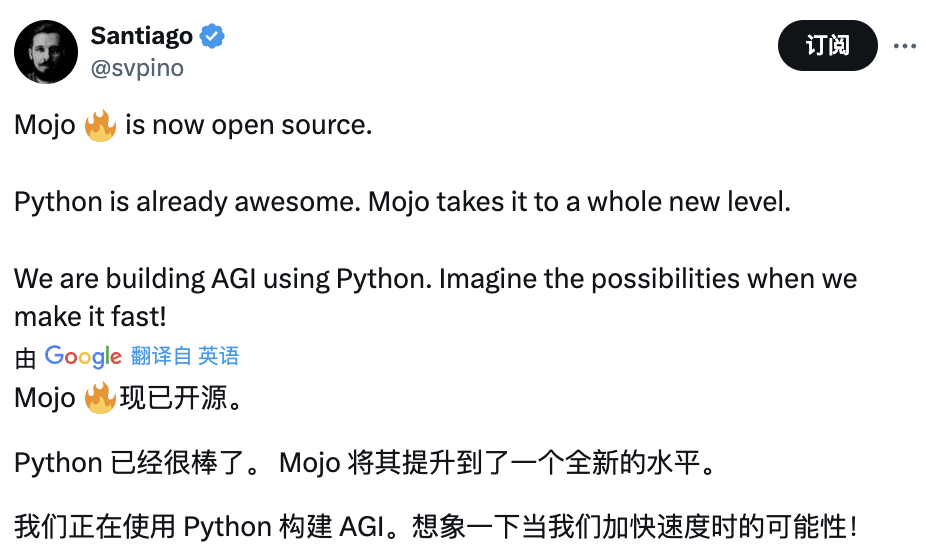 现已开源。Python 已经很棒了。Mojo 将其提升到了一个全新的水平。我们正在使用 Python 构建 AGI。想象一下当我们加快速度时的可能性!”