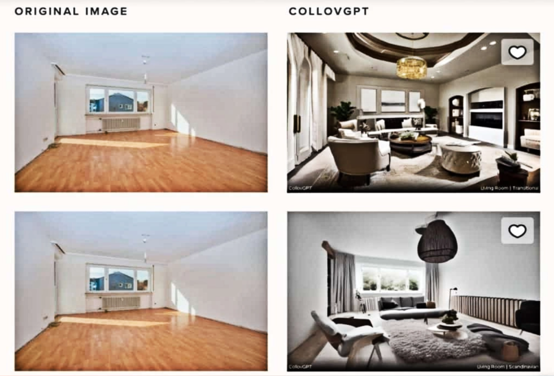 Collov 是一个室内设计AI生成器,通过使用人工智能将您的室内愿望转化为令人惊叹的、富有远见的室内设计效果图。不管客户的房间有多奇葩,要求多高,只需要上传房间照片,然后选择房间类型和客户喜欢的风格,AI就会一键生成多张装修效果图,各种风格都有,每一张都很精致,连里面的软装都生成好了。