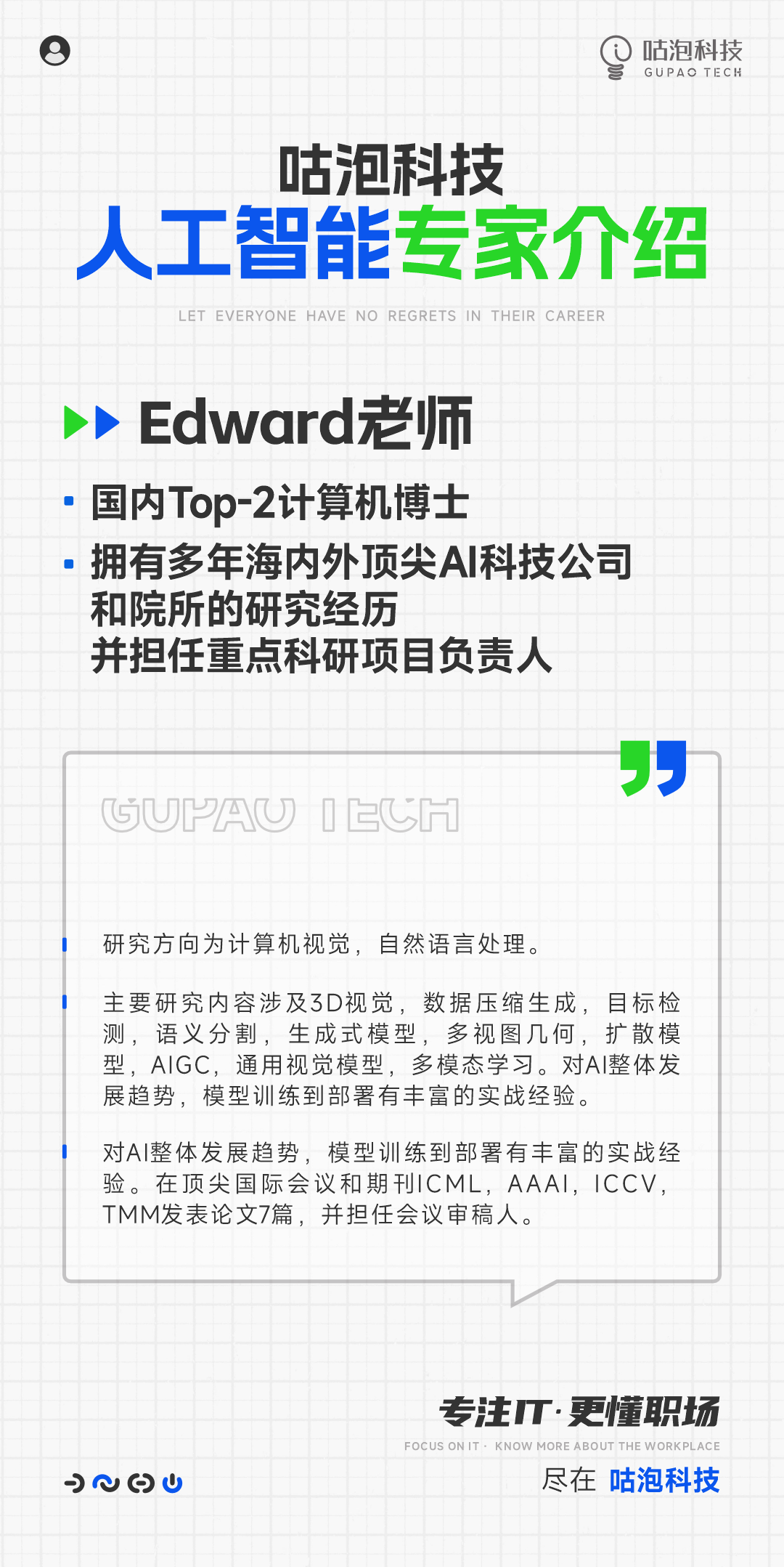 为此咕泡科技集结了100余+国内一线AI专家,他们或为名校导师,或发刊常青树,或在一线名企深耕数年;在这些导师的带领下,你将掌握正确的方法,去领悟顶刊顶会的套路,提炼创新点,学习如何去正确地写作,去叙述一个漂亮的story;