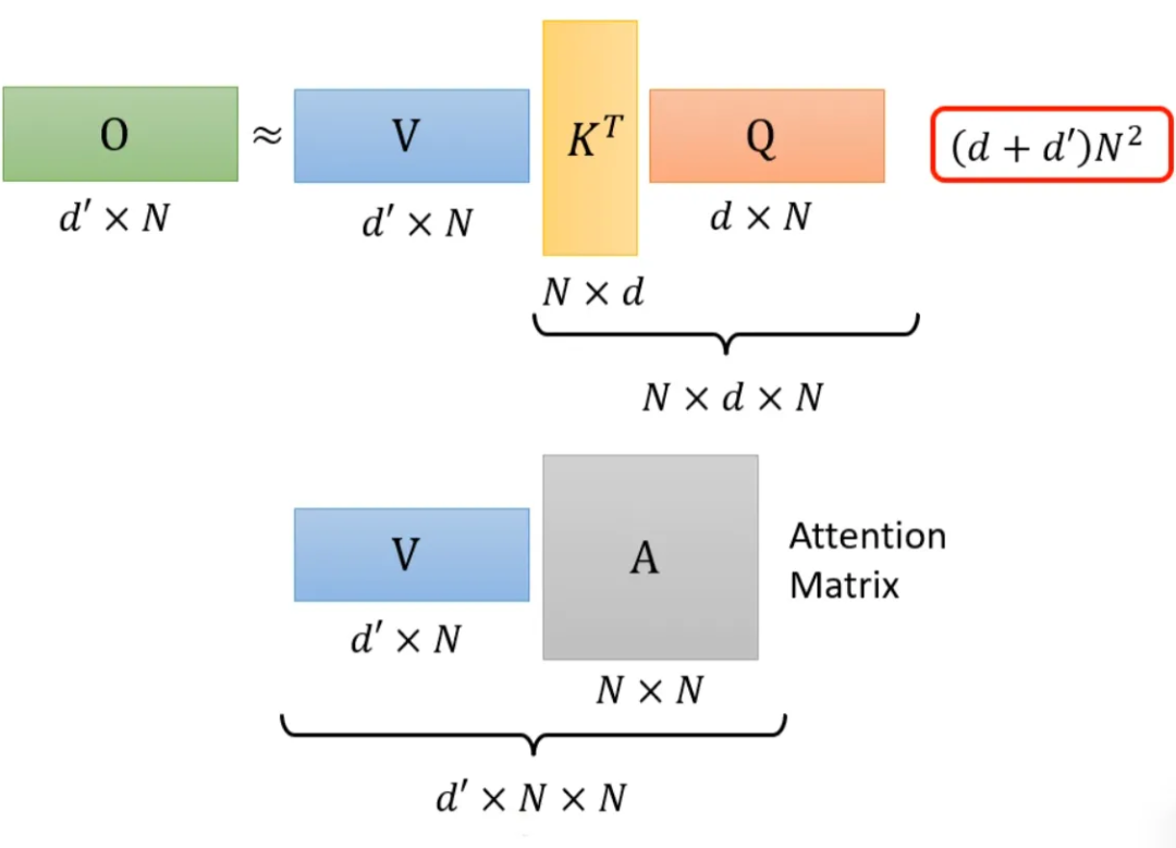 还是对上面的例子进行说明。如果 K^T*Q,会执行 N*d*N 次乘法。V*A,会再执行 d'*N*N 次乘法,那么一共需要执行的计算量是(d+d')N^2。