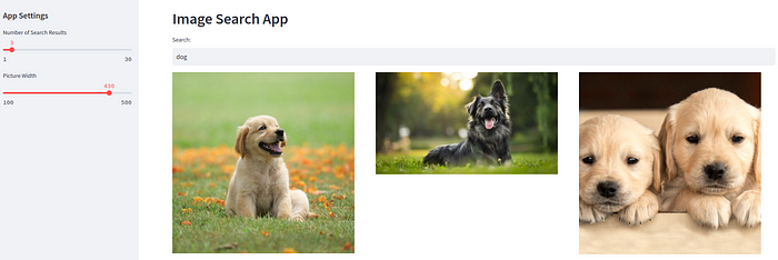 该应用程序脚本加载了先前保存的图像嵌入。它从搜索栏中获取用户输入的搜索词,并用它创建一个文本嵌入。然后使用文本嵌入找到前n个相似的图像嵌入,然后在应用程序中显示它们。使用滑块可以选择搜索结果的数量和图像宽度。