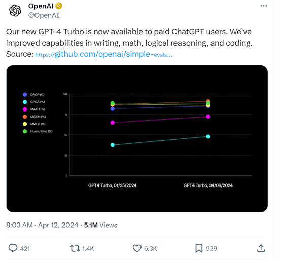 4月12日,OpenAI在社交平台宣布,Plus、企业版等付费ChatGPT用户,可以使用最新版本的GPT-4 Turbo模型。
