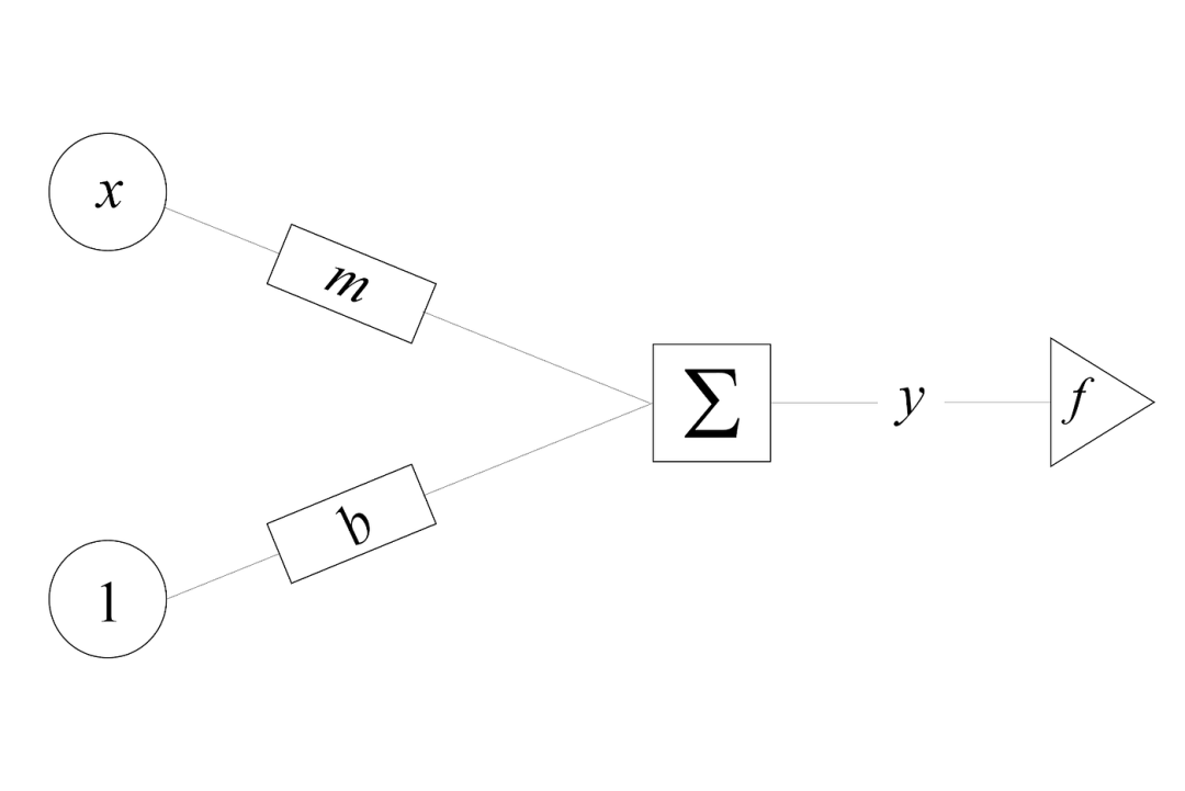如果我们将这个方程结构化为一个感知器,我们可以看到:其中输出( )是偏差( )与输入( )乘以权重( )的和( )。神经网络通常具有激活函数,它基本上决定了一个给定神经元的输出( )是否应该被认为是“激活的”,并将感知器的输出值保持在一个合理的可计算范围内(例如,sigmoid函数用于