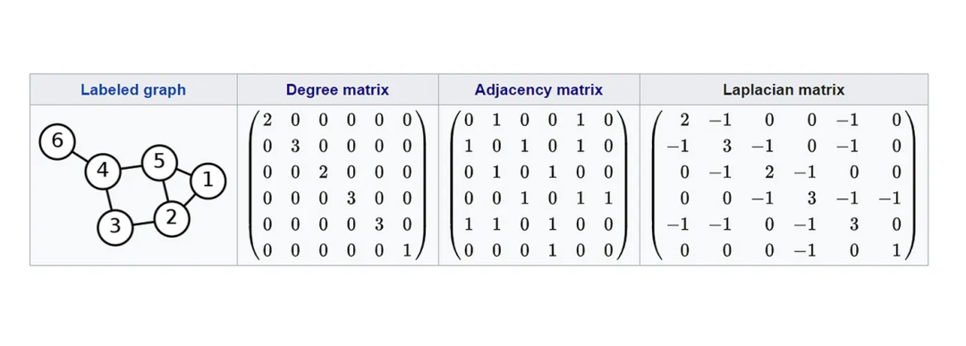 (带权重的)邻接矩阵Adjacency Matrix(A):图的邻接矩阵由1和0组成,除非它是加权或带标签的。在任何情况下,A都可以按照以下规则构建:无向图的邻接矩阵因此在其对角线上是对称的,从左上角对象到右下角:有向图的邻接矩阵只覆盖对角线线的一侧,因为有向图的边只朝一个方向。邻接矩阵可以是“带权重的”,这基本上意味着每条边都有与之关联的值,所以不是1,而是将值放在相应的矩阵坐标中。这些权重可以代表任何你想要的东西。例如,在分子的情况下,它们可以表示两个节点(原子)之间的键的类型。在LinkedIn这样的社交网络中,它们可以表示两个节点(人)之间的1st、2nd或3rd级连接。边的权重概念是使GNNs如此强大的一个属性;它们允许我们考虑结构性(依赖性)和独立性信息。对于实际应用,这意味着我们可以考虑外部和内部信息。图的度矩阵可以通过之前介绍的度概念来找到。D本质上是一个对角矩阵,其中对角线的每个值都是其对应节点的度数。不要忘记度数只是邻接矩阵的每一行的总和。然后,这些度数被放在矩阵的对角线上(邻接矩阵的对称线)。这很好地引出了最后的矩阵:图的拉普拉斯矩阵是通过从邻接矩阵中减去度矩阵而得到的:度矩阵中的每个值都减去了相应的邻接矩阵中的值,如下所示: