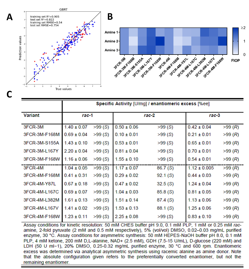 在前期的研究中,中国科学院化学研究所敖宇飞副研究员,德国Greifswald大学U. T. Bornscheuer教授,以及北京师范大学理论及计算光化学教育部重点实验室申林教授合作建立了转氨酶3FCR的催化活性和选择性机器学习模型(Angew. Chem. Int. Ed. 2023, 62, e202301660)。他们利用基于结构的理性改造策略快速获得多样性高的催化性能数据,并设计出一套改进型独热(one-hot)描述符,用以描述底物和氨基酸的电子效应和位阻效应;在此基础上建立梯度提升回归树(GBRT)模型,成功地预测了转氨酶3FCR催化不同底物反应的活性和立体选择性,进而不断加入新的数据,提升机器学习模型性能;此外还将其应用于设计具有更高催化性能的突变体,展示了数据驱动的蛋白质工程的应用潜力。