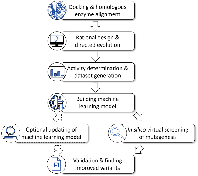 尽管这些例子证明了 ML 方法与传统蛋白质工程方法相比在理论和策略上的优势,但该方法的实用性仍然不足。一个主要问题是,机器学习模型只能通过在大型数据集上进行训练来建立,而大型数据集通常需通过深度突变扫描(DMS)等费时费力的试验来收集。因此,我们设想了一个实用的蛋白质工程研究范式,在这个过程中,ML 方法不是定向进化和理性设计的竞争方法,而是它们的重要补充(图 1)。具体来讲,首先依靠传统的定向进化和理性设计方法获得具有良好催化性能的变体,利用在此过程中获得的实验数据建立目标底物的 ML 模型,将其应用于设计更好的变体,并通过不断迭代提升模型预测精度。