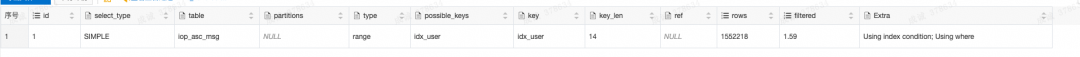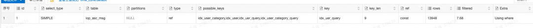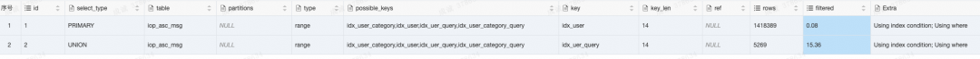 可知若使用该索引,idx_user所有的叶子结点都会扫描一遍!之前强制使用该索引查询时扫描行数一百多万,主键id索引的基数三百多万,两者是同一量级。idx_user(gmt_create,id_user,category,sub_category)索引在上述sql的应用场景是不合理的,特别是在按创建时间的分表规则下。笔者将其改为idx_user(id_user,category,sub_category,gmt_create,is_read)(因为是否已读也常见于业务条件中,因此加上)。更改之后,再次查看sql语句的执行计划,发现这次优化器坚定的选择了idx_user(id_user,category,sub_category,gmt_create,is_read)索引。这次扫描行数只有一万多行。与idx_uer_query(id_user,category)索引相比,该索引还能减少回表次数。