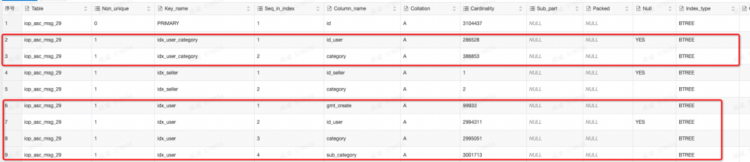 发现该表有个名为idx_user的索引,该索引是gmt_create,id_user,category,sub_category四个字段的联合索引。这几个字段刚好都在上面慢sql的where条件中。看起来tddl调整sql语句的顺序是为了利用该索引。