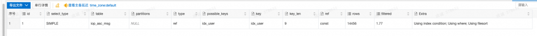 发现idx_user(gmt_create,id_user,category,sub_category)的gmt_create列的基数为99933,idx_uer_query(id_user,category)的id_user的基数为286528优于前者。综合考虑,所以优化器选择idx_uer_query(id_user,category)索引。上面我们分析的两个索引的基数差距并不是很大(优化器也可能预估错误),然而idx_user(gmt_create,id_user,category,sub_category)索引在查询语句中的条件中的匹配度更高和使用索引idx_user(gmt_create,id_user,category,sub_category)可以避免排序(idx_user(gmt_create,id_user,category,sub_category)本身是索引,已经是有序的了,如果选择索引idx_user(gmt_create,id_user,category,sub_category)的话,不需要再做排序,只需要遍历),所以即使扫描行数多,也判定为代价更小。会有这样的情况发生吗?多次执行,看看其他分表的执行计划,发现优化器这次使用了idx_user索引!tddl优化器和索引idx_user(gmt_create,id_user,category,sub_category)里应外合误使优化器选择了错误的索引。选择了一百多万的扫描行数的执行方案。