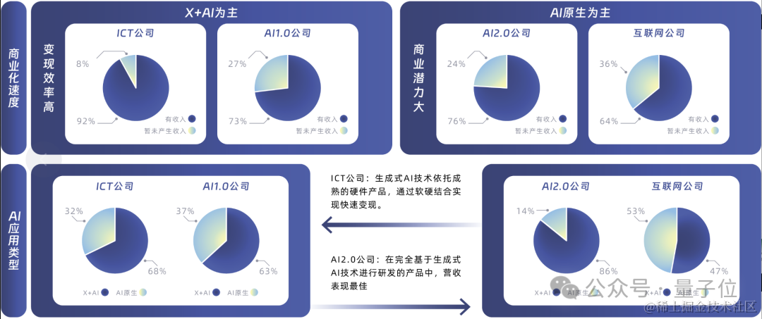 所谓 AI 原生好理解,是指完全基于生成式 AI 技术打造;X+AI 通俗地理解就是在原先不含 AI 的产品中加入生成式 AI 相关技术。