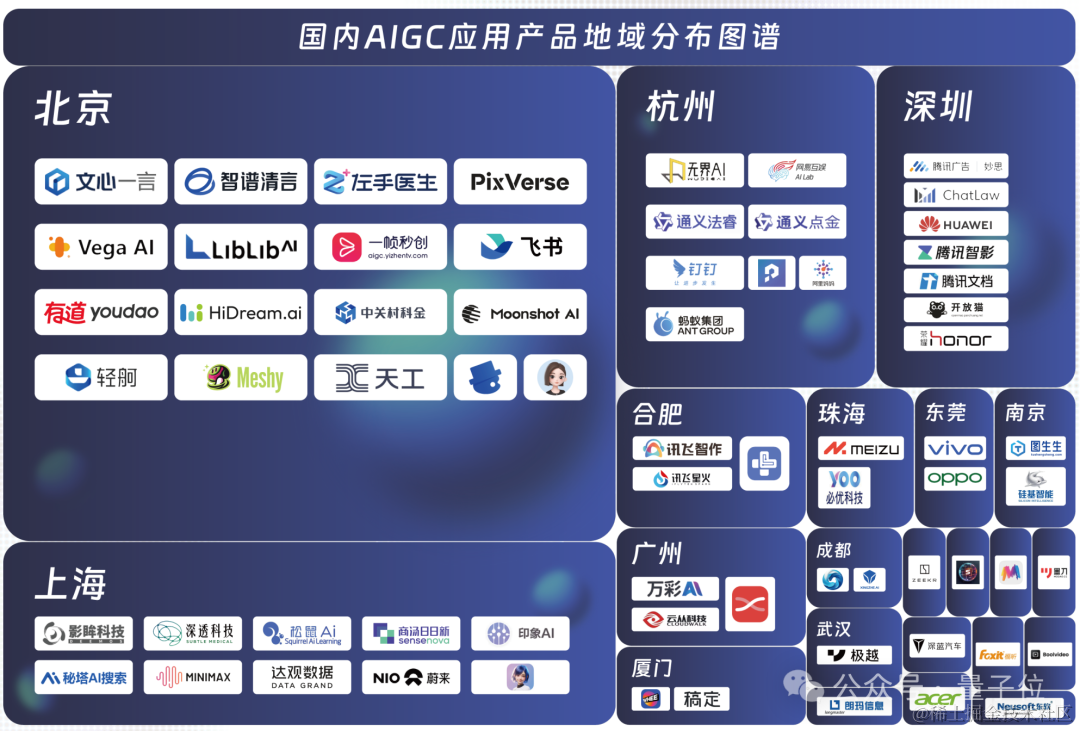全国 AIGC 应用产品地域分布图谱如下,北京以互联网公司和 AI2.0 公司为主,代表玩家最多。