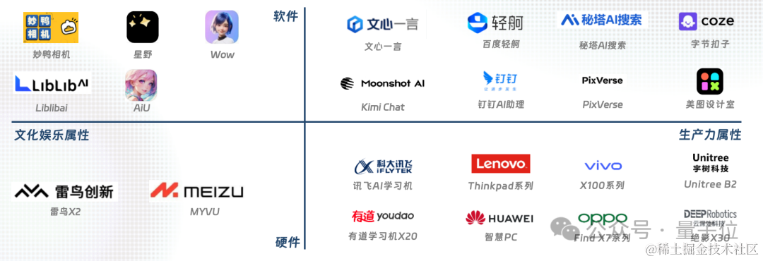 按照作用属性以及软硬件形态,厂商及代表产品划分如下。具备生产力属性的产品占比达 「95%」 以上。