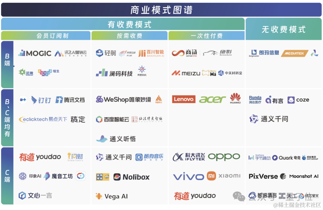 而 C 端产品以智能助手以及图像生成类的生产力工具为主,虽然用户量大(纯 C 端占比 50% 以上),但「盈利状况普遍不乐观,近 50% 的产品当前仍未有明确的收入模式」,以免费为主。