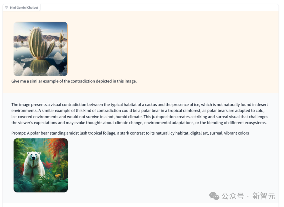 当我们把相似的输入给到Mini-Gemini,它会怎么回答呢?可以发现,Mini-Gemini也可以识别出图片中的元素,并且合理地建议,同时生成了一只对应的毛线小熊。通过一些抽象的多模态指令来让模型给出推理,并生成合适的图片,这个操作就很像是ChatGPT和DALLE3的联动了!接下来让Mini-Gemini做自己最擅长的推理和图片理解,看看它表现。输入冰川中的仙人掌,它会解释其中的矛盾并生成一张热带雨林中北极熊的图片:图片呈现了仙人掌的典型栖息地与冰的存在之间的视觉矛盾,因为在沙漠环境中自然不会出现冰。Mini-Gemini正是理解了这种矛盾点,才生成了一张北极熊出现在热带雨林的图片。这种并置创造了一个引人注目且超现实的视觉效果,挑战观众的期待,并可能引发人们对气候变化、环境适应或不同生态系统融合的思考。同时,正如ChatGPT+DALLE3的梦幻结合一样,Mini-Gemini的「推理生成」功能还可以在多轮对话中通过简单指令生成连环小故事。
