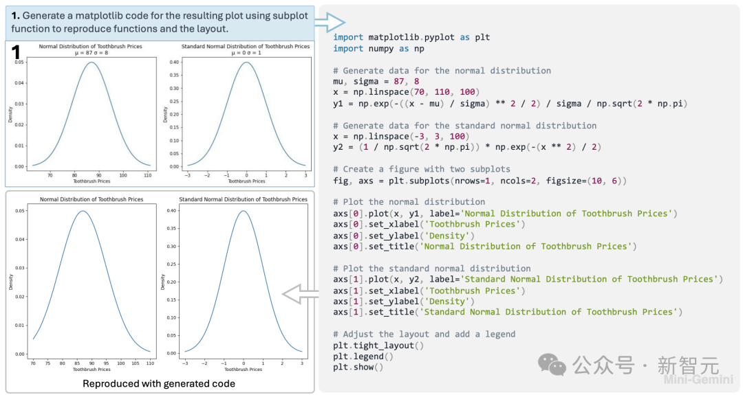 Mini-Gemini会根据前文的文字生成结果和用户输入进行推理,在保持一致性的情况下对图片进行修改,使其更符合用户的要求。当然,Mini-Gemini对于多模态模型的传统技能图片理解也不在话下。比方让模型理解输入曲线图的数学意义(高斯分布),并让它使用代码复现这张图。通过运行生成的代码,模型可以高质量地还原曲线图,节省了复现的时间。超会玩梗