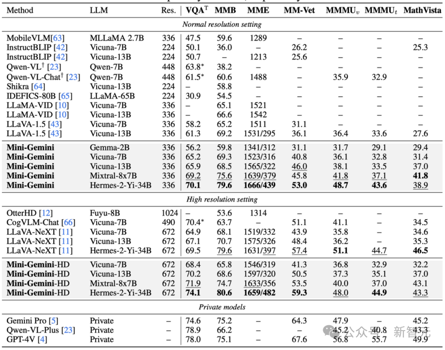 详细来说,Mini-Gemini将传统所使用的ViT当做低分辨率的Query,而使用卷积网络(ConvNet)将高分辨率的图像编码成Key和Value。使用Transformer中常用的Attention机制,来挖掘每个低分辨率Query所对应的高分辨率区域。从而在保持最终视觉Token数目不变的情况下去提升对高清图像的响应,保证了在大语言模型(LLM)中对于高清图像的高效编码。值得一提的是,由于高分辨率分支卷积网络的使用,可以根据需要对图像所需的分辨率自适应调整,能够遇强则强。对于图像的生成部分,Mini-Gemini借助了SDXL,使用LLM推理后所生成的文本链接两个模型,类似于DALLE3的流程。而对于数据这个「万金油」,Mini-Gemini进一步收集并优化了训练数据的质量,并加入了跟生成模型结合的文本数据进行训练。在仅使用2-3M数据的情况下,实现了对图像理解、推理、和生成的统一流程。Mini-Gemini在各种Zero-shot的榜单上毫不逊色于各种大厂用大量数据训练出来的模型,可谓是「平、靓、正」 !媲美Gemini Pro和GPT-4V