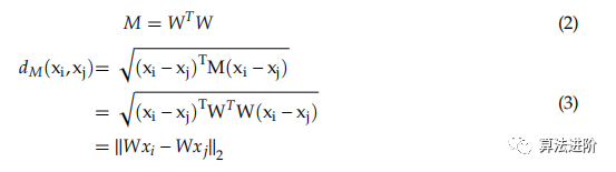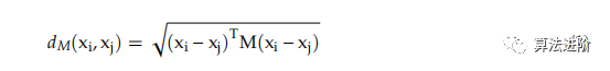 文献中的度量学习研究与马哈拉诺比斯距离度量直接相关。训练样本X由N个d维向量组成,xi和xj之间的距离计算公式为马哈拉诺比斯距离: