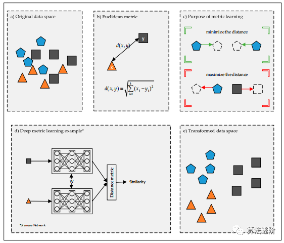 每个数据集在分类和聚类方面都有特定的问题,需要一个良好的距离度量才能获得成功的结果。度量学习方法通过分析数据提供了新的距离度量,提高了样本数据的区分能力。其主要目的是学习一个新的度量,以减少同一类样本之间的距离并增加不同类样本之间的距离。这样可以在不同对象之间创造更大的间隙,从而优化分类和聚类的效果,如图1c。