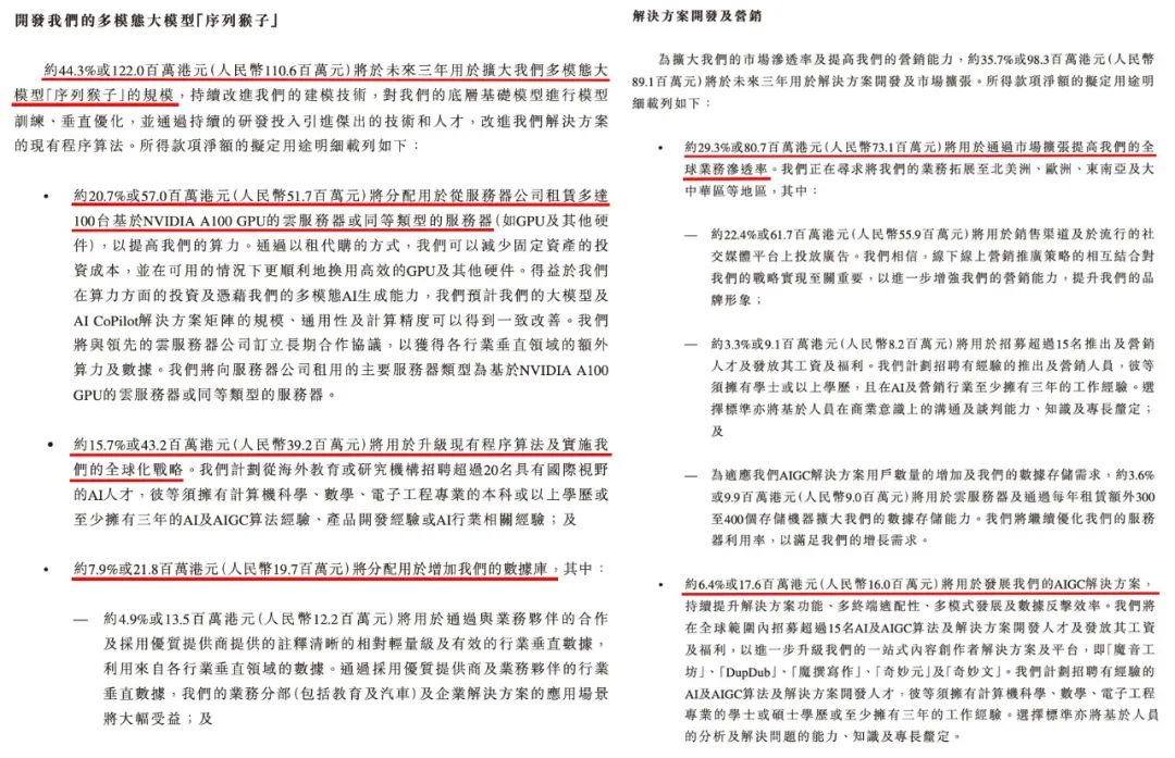 但这个排名显然已经没什么参考性,过去两年,随着ChatGPT掀起生成式AI巨浪,国内外AIGC参与者、产品和服务都已经大洗牌。当人们列数国内大模型及AIGC产品第一梯队,鲜少将出门问问的名字包含在内。从投资来看,出门问问在2013年~2019年共获7轮融资,投资方包括谷歌,累计融资额约2.33亿美元,此后再未进行新融资。截至2023年10月31日,其现金及现金等价物不到1.6亿元。顶着“AIGC第一股”光环,出门问问的AIGC解决方案热度有余,但实绩显然还不够掷地有声。此次IPO,出门问问拟募资金额最高为3.04亿港元(折合约2.81亿人民币),实际募资金额为2.67亿港元(折合约2.47亿人民币)。其中约44.3%资金(约1.11亿元)将用于未来三年扩大多模态大模型序列猴子的规模,35.7%资金(约8910万元)将用于解决方案开发及市场扩张。在扩大多模态大模型序列猴子的规模方面,其资金用途主要包括从服务器公司租赁多达100台基于NVIDIA A100 GPU的云服务器或同等类型服务器、招募AI人才、增加数据库。