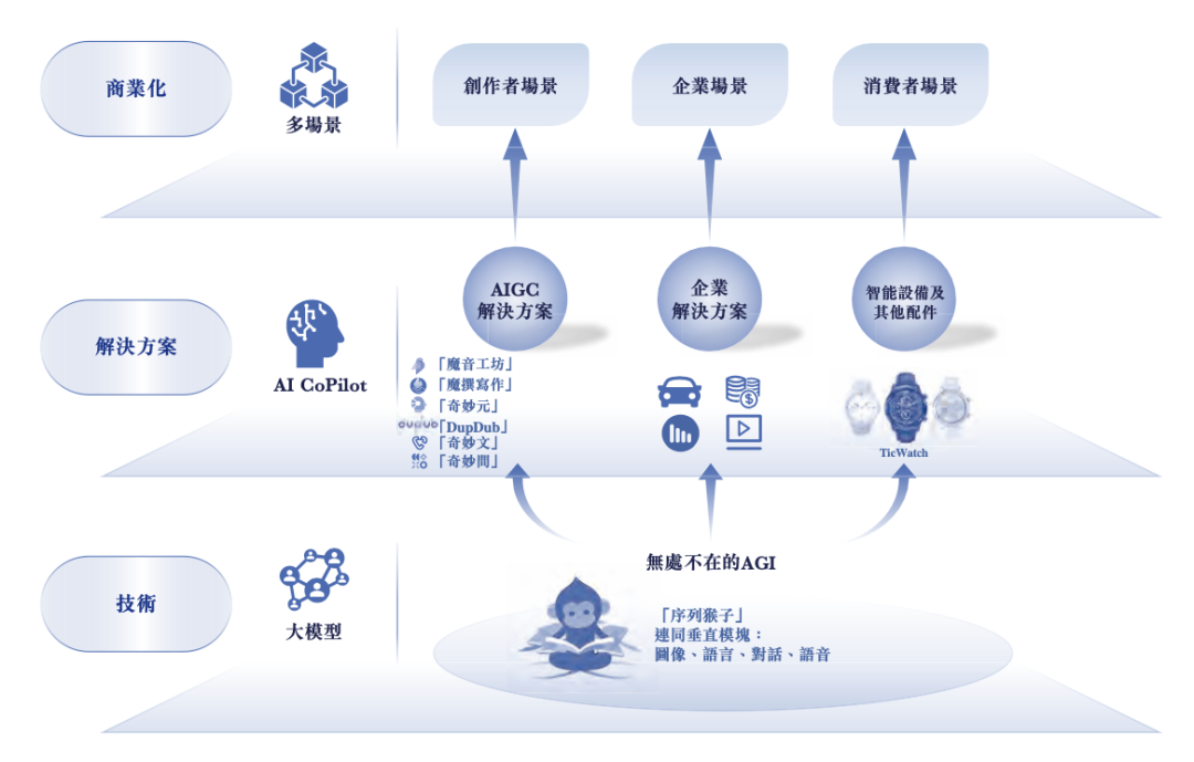 出门问问成立于2012年,起初主攻智能硬件,然后发展出以智能车载为主的AI企业解决方案,2015年凭借TicWatch拿到谷歌投资,2017年又与大众汽车合作研发智能车载技术。但这两大业务都开始走下坡路,招股书显示,其智能设备销量连续下滑,且与大众汽车的知识产权安排项目于2023年6月结束,这将导致其AI企业解决方案收入进一步减少。而近两年车载AI解决方案一直是出门问问的主要收入来源。找到一条可持续的商业化路径成为当时出门问问最关键的难题。恰遇AI大模型新风口,出门问问火速入局,并构建起产品矩阵,去年4月发布自研多模态多模态大模型序列猴子,并推出面向内容创作的一系列AIGC解决方案。招股书中灼识咨询数据显示,2022年全球AIGC产品和服务收入,出门问问在全球位列第8,在亚洲排名第一。前7名都是英美企业,分别是OpenAI、Jasper、Midjourney、Descript、Synthesia、Stability AI、Copy.AI。