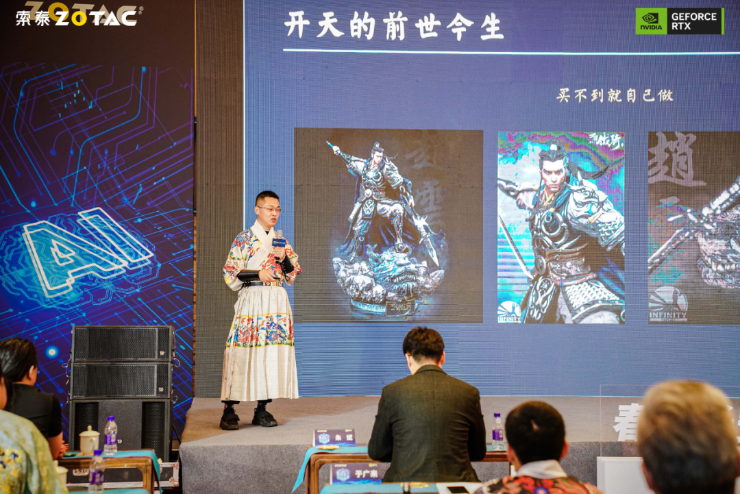 在峰会现场,索泰也展示了不少在AI创作、AI算力上有强大优势的显卡和主机。充满科技感的设计,搭配强劲的性能,正是AI时代所需要的的硬件装备。