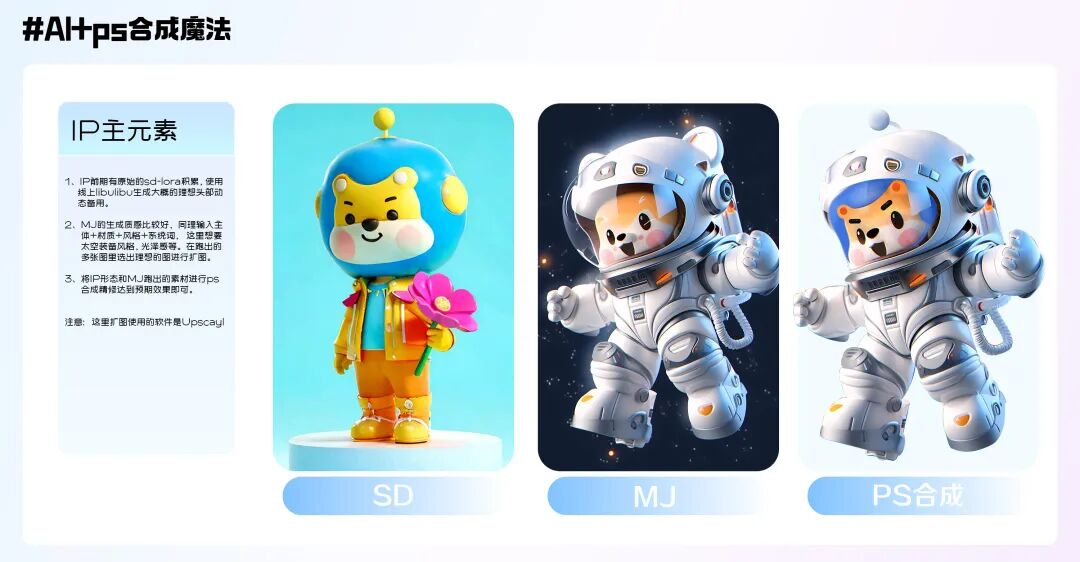 IP前期有自己炼的SD loar,利用线上libulibu跑出一个头部理想的角度状态,MJ跑出想要的装备效果,PS合成精修即可。这里用到的扩图软件是Upscayl。