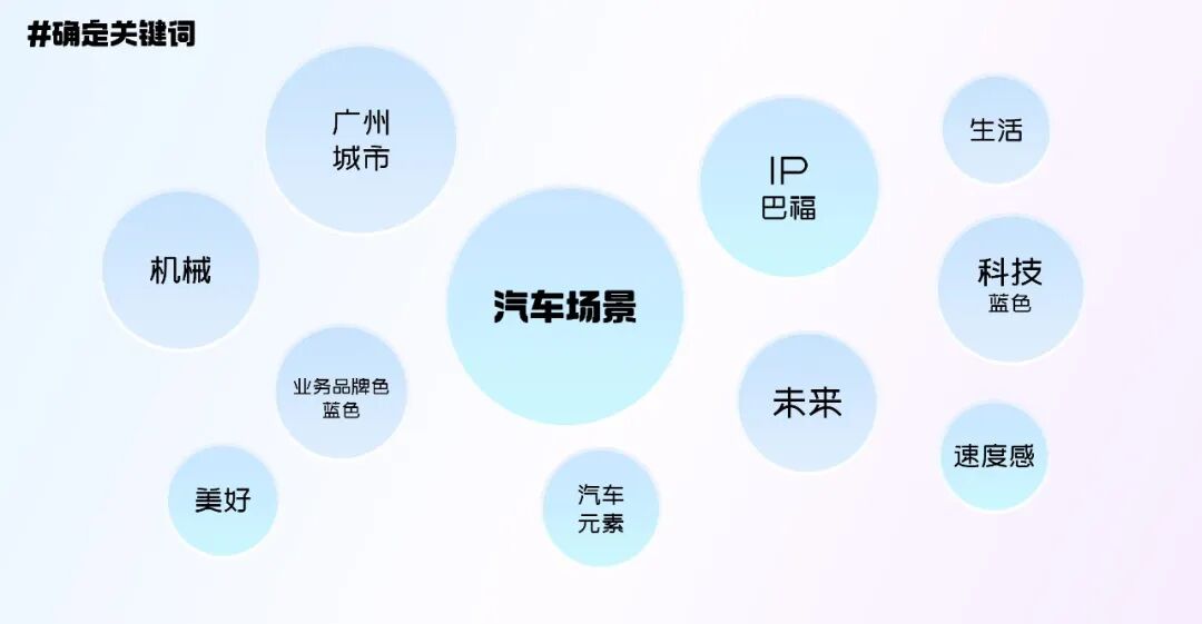 锁定关键词,汽车场景,体现广州地标建筑,融入业务IP巴福,体现车展主题未来科技等。思考构图和配色,锁定重点参考方向,确定设计风格定位。3、AI辅助创意+合成