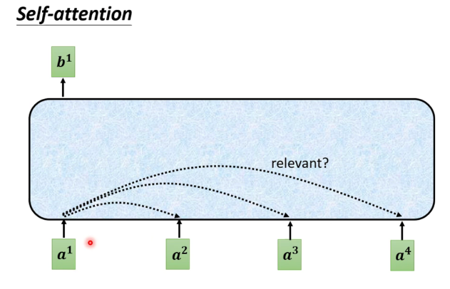 对于每一个输入向量a,经过蓝色部分self-attention之后都输出一个向量b,这个向量b是考虑了所有的输入向量对a1产生的影响才得到的,这里有四个词向量a对应就会输出四个向量b。