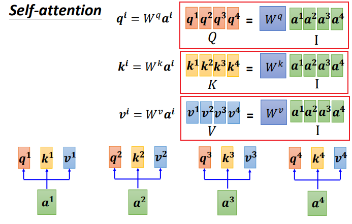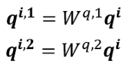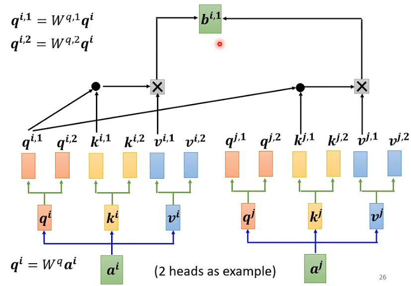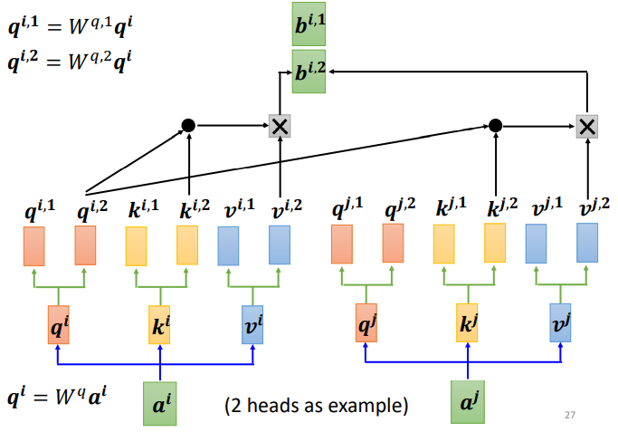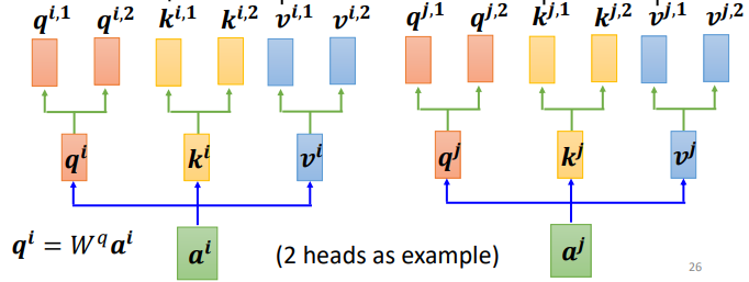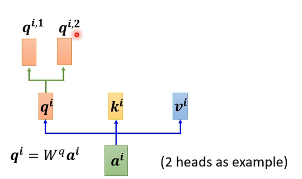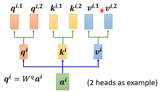 首先,和上面一样,用a乘权重矩阵W得到,然后再用乘两个不同的W,得到两个不同的,i代表的是位置,1和2代表的是这个位置的第几个q。