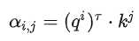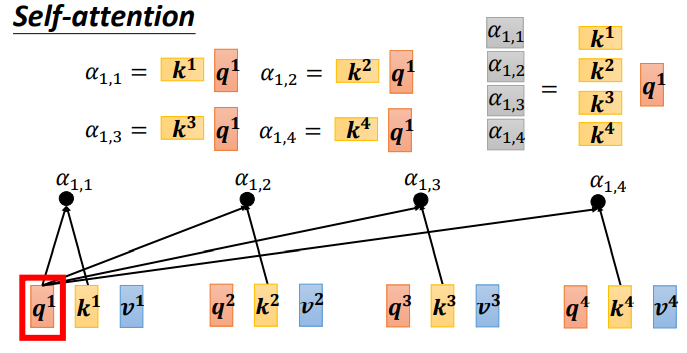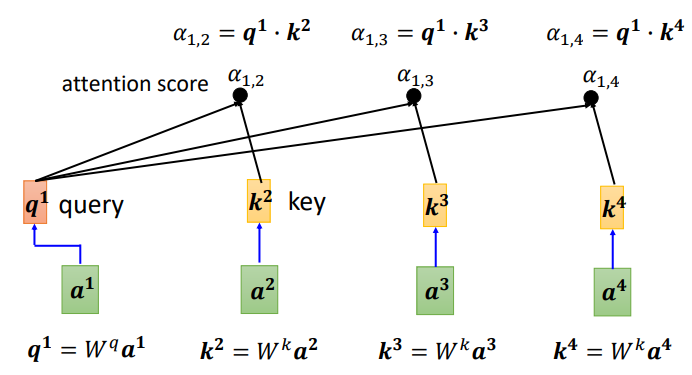 可以计算每一个α(又称为attention score),q称为query,k称为key