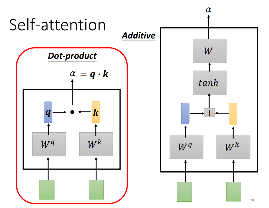 Dot-product方法是将两个向量乘上不同的矩阵w,得到q和k,做点积得到α,transformer中就用到了Dot-product。