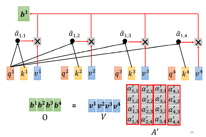 先求v,v就是键值value,v和q、k计算方式相同,也是用输入a乘以权重矩阵W,得到v后,与对应的α′ 相乘,每一个v乘与α'后求和,得到输出b1。