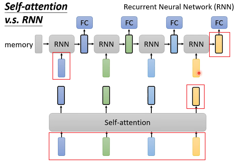 比如对于最后一个RNN的黄色输出,想要包含最开始的蓝色输入,必须保证蓝色输入在经过每层时信息都不丢失,但如果一个sequence很长,就很难保证。而Self-attention每个输出都和所有输入直接有关。