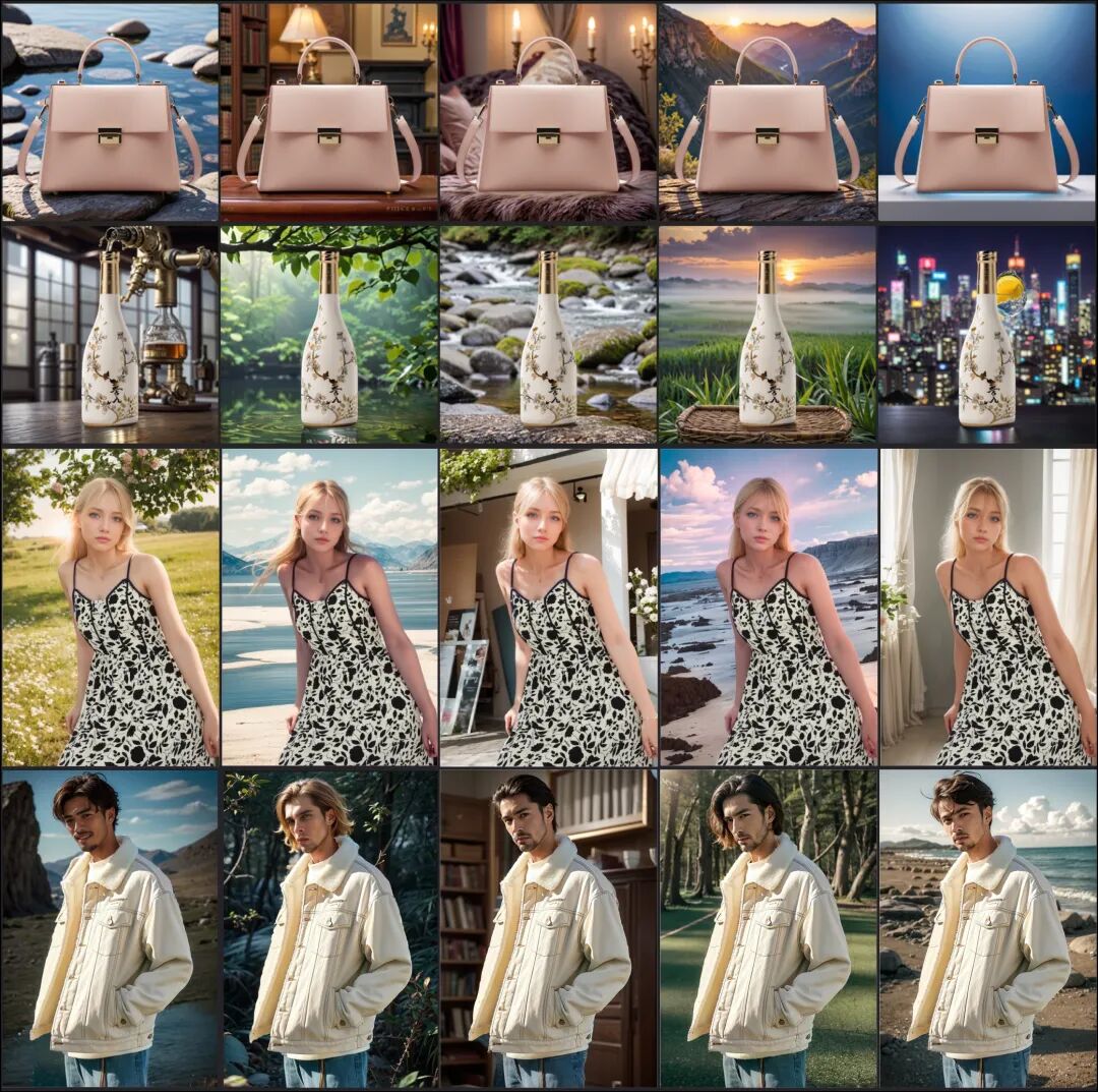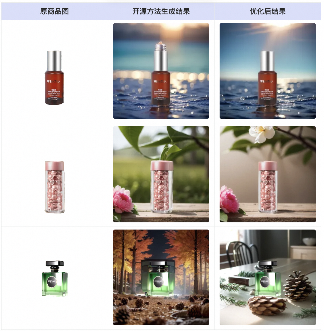 ✍🏻 本文作者:云芑、因尘、岁星、也鹿 1. 背景 随着AI生成内容(AIGC)技术如Diffusion的飞速进展,现如今,大家已能够轻易地使用Stable Diffusion(SD)[1]等文生图的模型或工具,将心中所想仅凭语言描述(prompt)即转化为具体图像。基于此,我们不禁思考:是否有可能进一步发展该技术,允许用户通过描述来为商品定制特定背景,从而协助商家快速且轻松地打造理想的商品图像?例如,为一个包生成一个室内桌面摆放的背景,或是为某款连衣裙创造出站在海边的、气质甜美的模特形象等。
