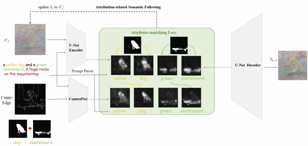 图像控制条件下的属性绑定效果 3.1 解决方案 首先,我们可以通过语法分析得到物体及要绑定的属性。然后,在生图过程中,我们引入了object mask来代表视觉控制中需要绑定属性的物体区域,同时设计了简单而有效的目标函数,在视觉控制条件和object mask的双重约束下,在隐空间拉近属性词与物体词attention map分布的距离。具体来说,如下图所示,文本提示 和图像条件 作为图像控制生成的基本输入,其中 表示提示的长度。此外,还提供了相关的object mask集合 ,其中 表示与